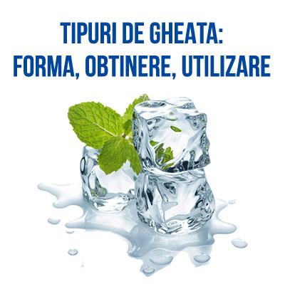 Fiecare tip de gheata are un scop anume. Unele au scopul de a raci bauturile racoritoare si cocktail-urile, in timp ce altele au ca si scop prezentarea produselor sau sunt destinate utilizari in industria farmaceutica si medicala. Cele mai des intalnite tipuri de gheata sunt: cuburi de gheata pline, cuburi de gheata goale (tip glont), fulgi de gheata si gheata...