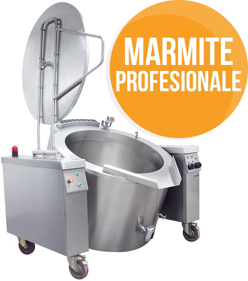 Marmitele sunt utilizate in bucatariile profesionale mari pentru realizarea unor preparate lichide (supe, creme, ciorbe) in cantitati mari. Alimentarea cu apa se face printr-un robinet montat pe panoul superior iar scoaterea preparatului final (componenta lichida) se poate face printr-un robinet aflat in partea de jos a panoului frontal. Alimentarea marmitelor: - Alimentare electrica - Alimentare pe gaz - Alimentare pe...