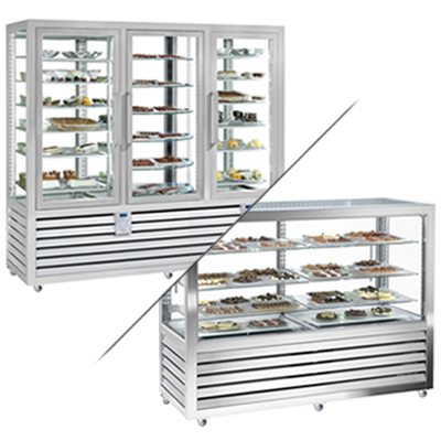 Avand in vedere varietatea de modele de vitrine pentru cofetarie, puteti opta pentru acelea care va indeplinesc toate asteptarile. In functie de model, caracteristicile pot varia: suprafata de expunere si laterale confectionate din inox, geam frontal dublu curbat sau drept, geamuri laterale duble cu finisaje cu PVC, rafturi ajustabile, iluminare interna, programator electronic, depozitare frigorifica sau neutra, usi culisante duble in partea din spate, perdea de noapte pentru versiunea de autoservire, lampi cu incalzire pentru versiunea de patiserie, iluminare cu led, decoratiuni la comanda, umidificator cu ultrasunete, blat de granit, posibilitate de multiplexare etc.