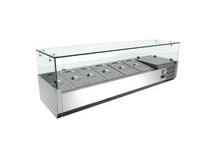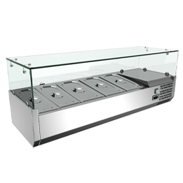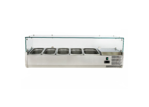 Vitrina ingrediente sushi, inox, 5 cuve GN1/3, 150*41.5*30 cmTPKSS150Putere: 160 WDimensiuni (cm): 150*41.5*30Capacitate: 5*GN1/3Structura: Plastic + vitrina din sticlaTensiune alimentare: 220V/50HzTemperatura de lucru: 0/+6 grade CelsiusIluminare interioara LEDTemperatura ambientala: +32grade Celsius & 65% umiditateAgent racire: R600ARacire: staticaDezghetare manualaPanou de control electronicGreutate: 49 kg -