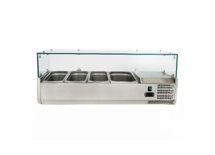 Vitrina ingrediente, inox, 4 cuve GN1/3 + 1 cuva GN1/2, 140*39.5*43.5 cm-23%TPK140380Putere: 145 WDimensiuni (cm): 140*39.5*43Capacitate: 4*GN1/3 + 1*GN1/2Structura: otel-inoxTensiune alimentare: 220V/50HzTemperatura de lucru: +2/+8 CTemperatura ambientala: +35 CAgent racire: R600aRacire: staticaPanou de control electronicIzolatie: 4,5 cmSticla temperataCuvele nu sunt incluseGreutate: 42 kgProdus promotionalPret normal 545,00 € Special Price 419,00 € + TVA -