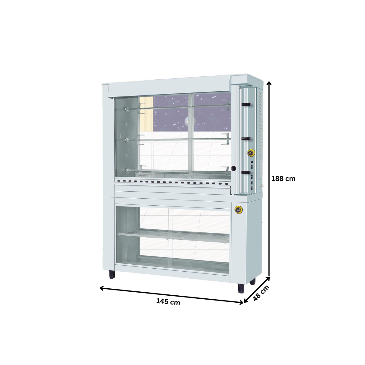 Rotisorul pe gaz este un echipament esential pentru restaurante, fast-food-uri si unitati de catering care doresc sa ofere preparate din carne gatite uniform si savuros. Acesta combina puterea si eficienta gazului cu un design practic si durabil, asigurand o gatire rapida si de inalta calitate. Cu capacitatea sa de 21 pui, dimensiune de 145*48*188 cm, constructia durabila, usurinta in utilizare si intretinere, acest rotisor reprezinta o investitie valoroasa pentru cresterea eficientei si a calitatii serviciilor oferite.