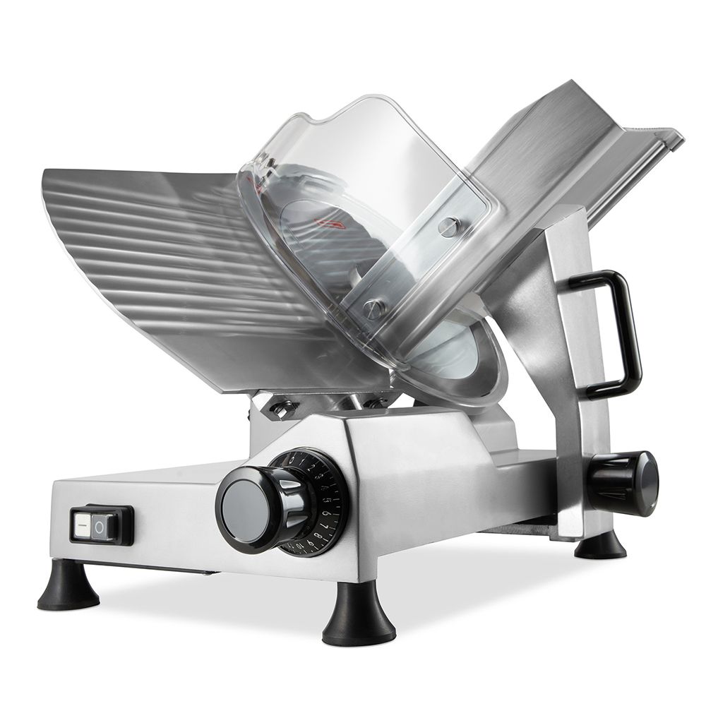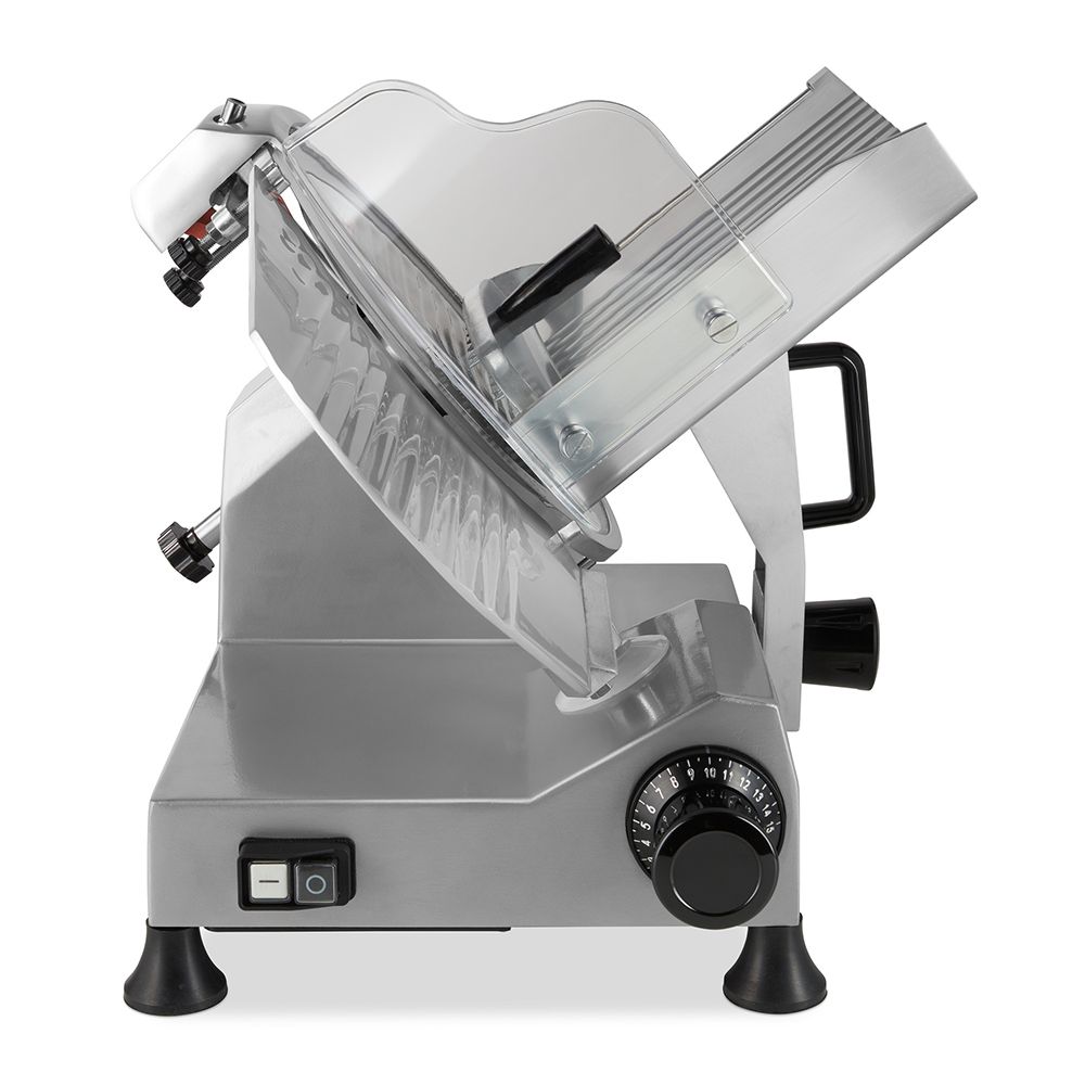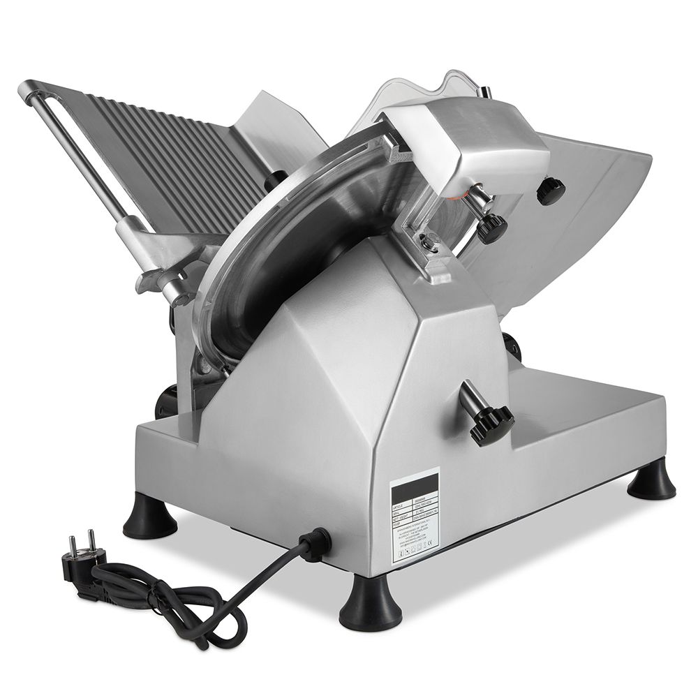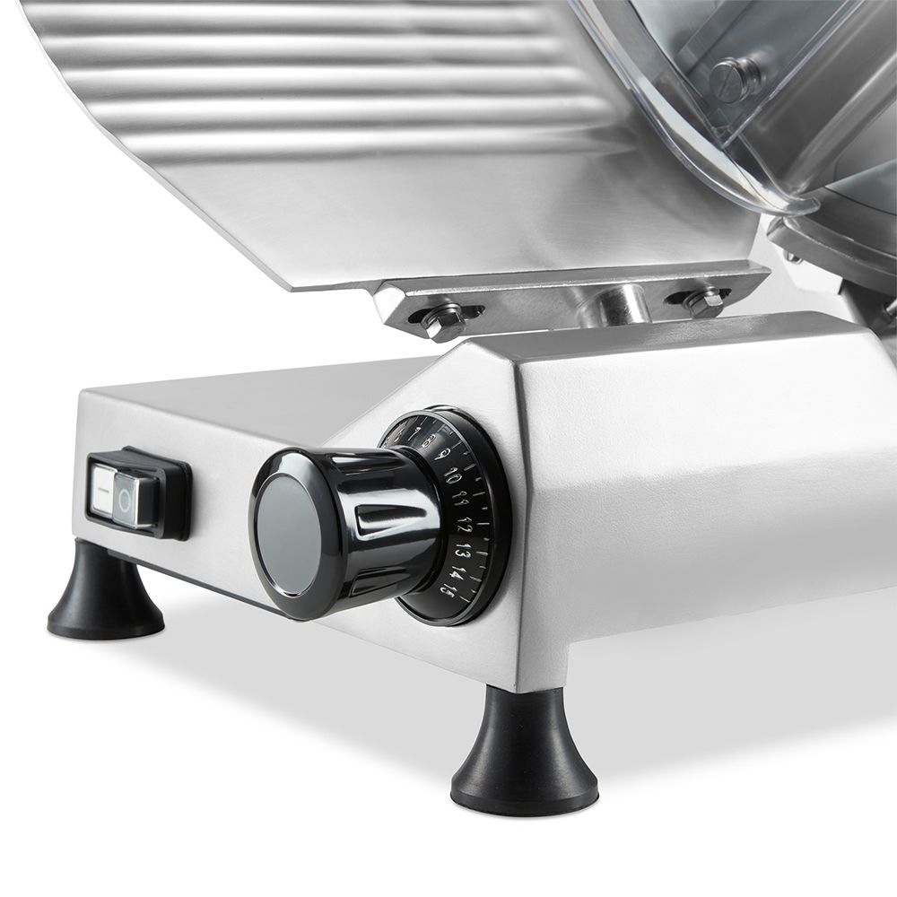 Taierea unor felii drepte si foarte subtiri poate fi o sarcina dificila atunci cand este facuta manual. Cu ajutorul acestei masini electrice profesionale de feliat mezeluri puteti realiza felii uniforme ideale pentru servirea clientilor dvs. Procesul de taiere cu acest instrument profesional si versatil este rapid si silentios. Lama din otel inoxidabil are un diametru de 30 cm, iar grosimea de taiere poate fi reglata intre 1-21 mm pentru fiecare felie, asigurand astfel ca feliile de sunca, salam, pastrama sau alte tipuri de mezeluri sunt intotdeauna taiate la grosimea exacta dorita de catre client.