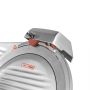 Operarea este simplificata, avand comutatorul pornit/oprit pozitionat lateral. Manerul poate fi actionat cu o singura mana, permitandu-va sa tineti produsul cu cealalta mana. In scopuri de igiena, purtati intotdeauna manusi in timpul taierii. Masina de feliat carne trebuie curatata si dezinfectata dupa fiecare utilizare. Placa de taiere si lama se pot spala impreuna in apa cu sapun si detergent usor. Carcasa poate fi curatata cu un burete umed si detergent. Apoi, clatiti cu apa si lasati la uscat inainte de a o utiliza din nou. Gratie celor patru picioare din cauciuc, masina de feliat carne ramane stabila in timpul utilizarii.