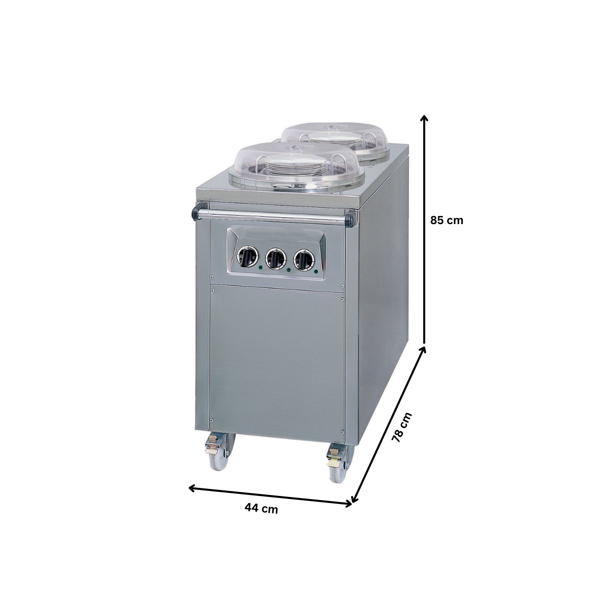 Dimensiunile caruciorului de 44*78*85 cm sunt adaptate pentru a gazdui o cantitate variata de farfurii, in functie de necesitatile specificate ale utilizatorului. Capacitatea sa poate varia de la modele mai mici, potrivite pentru evenimente mici sau medii, pana la carucioare mai mari, ideale pentru bucatariile comerciale cu un volum mare de servire.