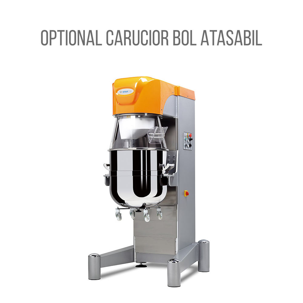 Dispozitivul de bucatarie este sigur de utilizat, avand protectie de siguranta fixa rotativa din plastic. In ciuda cantitatilor mari pe care le puteti procesa cu acest mixer planetar, puteti ridica fara niciun efort bolul cu ingrediente folosind liftul automat cu care acesta este prevazut. Pentru deplasarea bolului, puteti opta (optional) pentru caruciorul de bol. Mixer de restaurant prevazut cu temporizator si panou de control electromecanic, conceput pentru a fi pozitionat pe podea.