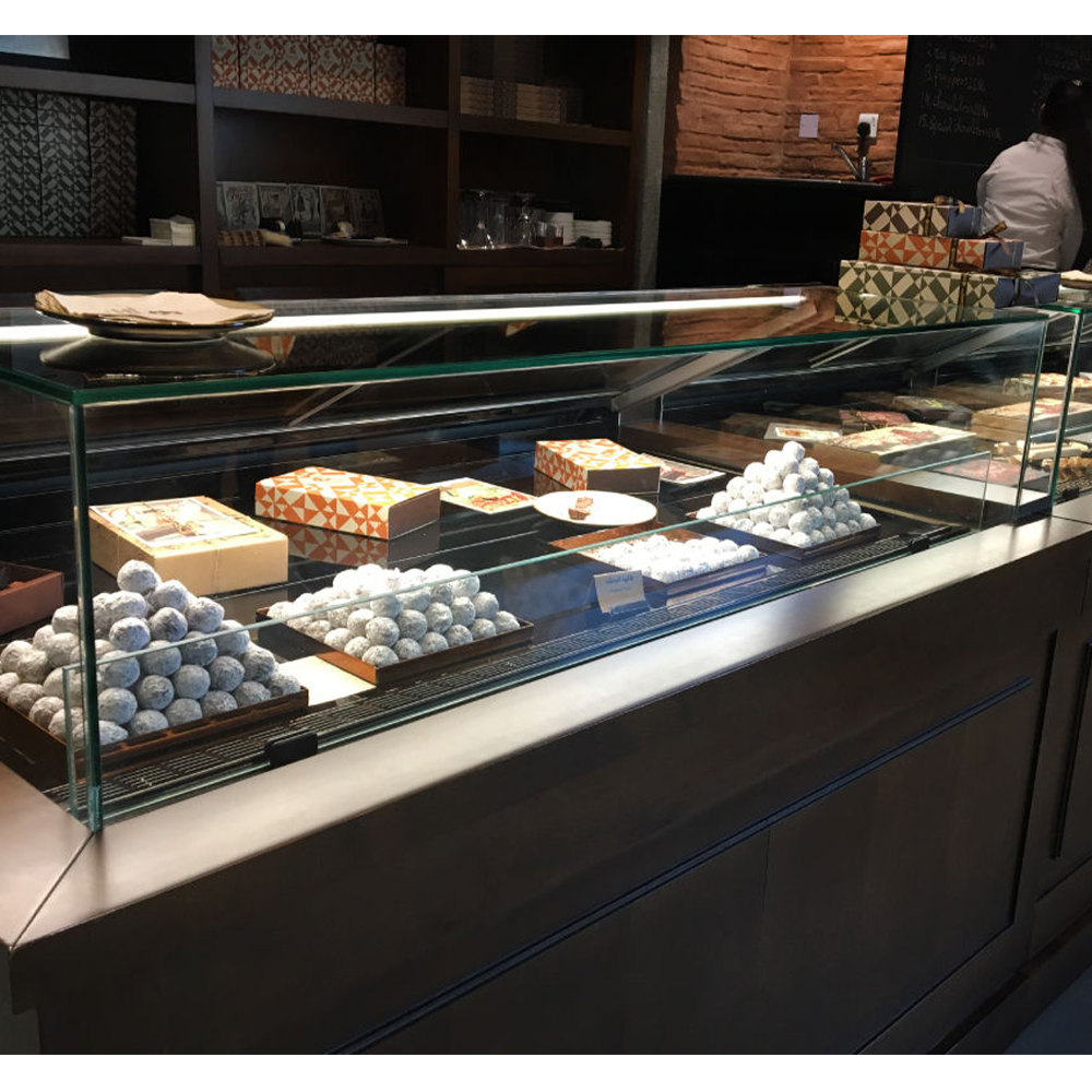 Prevazuta cu spatiu expunere din marmura cu latimea de 61,5 cm, iluminare interioara cu LED, geam frontal drept, geamuri glisante din plexiglas